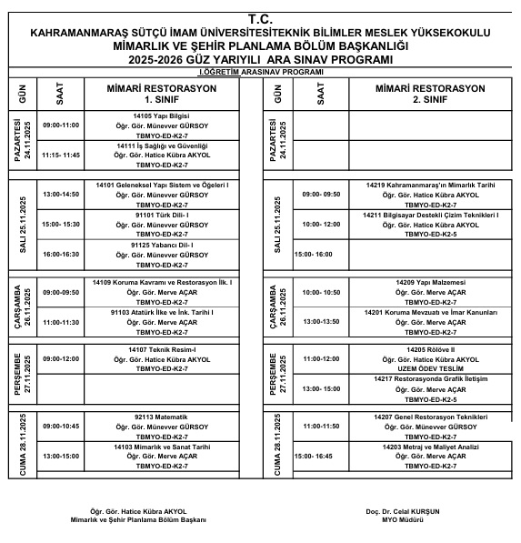 2025-2026 Güz Yarıyılı Ara Sınav Takvimi
