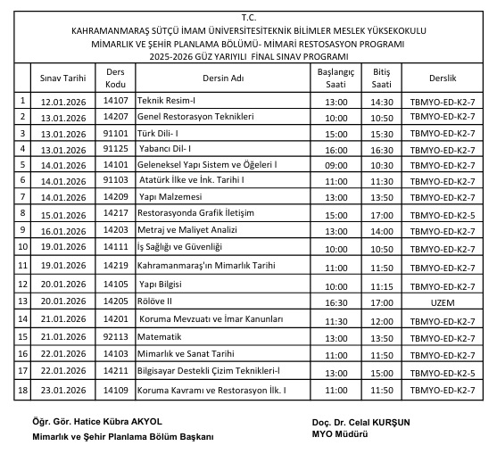 2025-2026 Güz Yarıyılı Final Sınav Takvimi