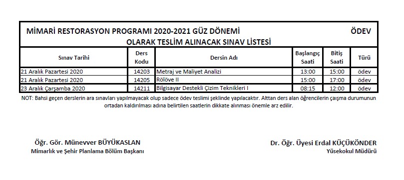 ÖDEV TESLİMİ ŞEKLİNDE YAPILACAK SINAV TARİHLERİ