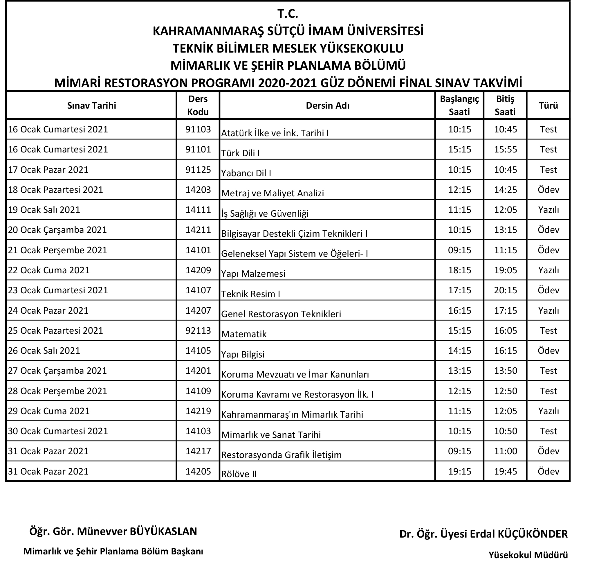 2020-2021 GÜZ DÖNEMİ FİNAL SINAVI PROGRAMI