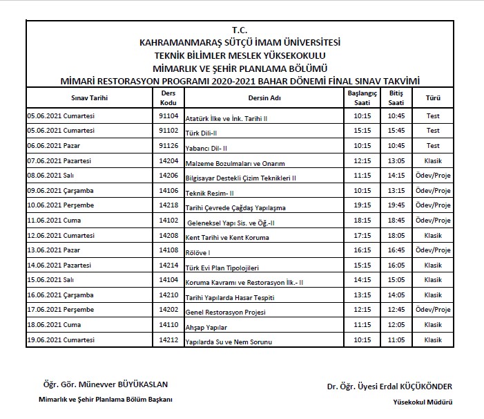 2020- 2021 BAHAR YARIYILI FİNAL SINAV TAKVİMİ