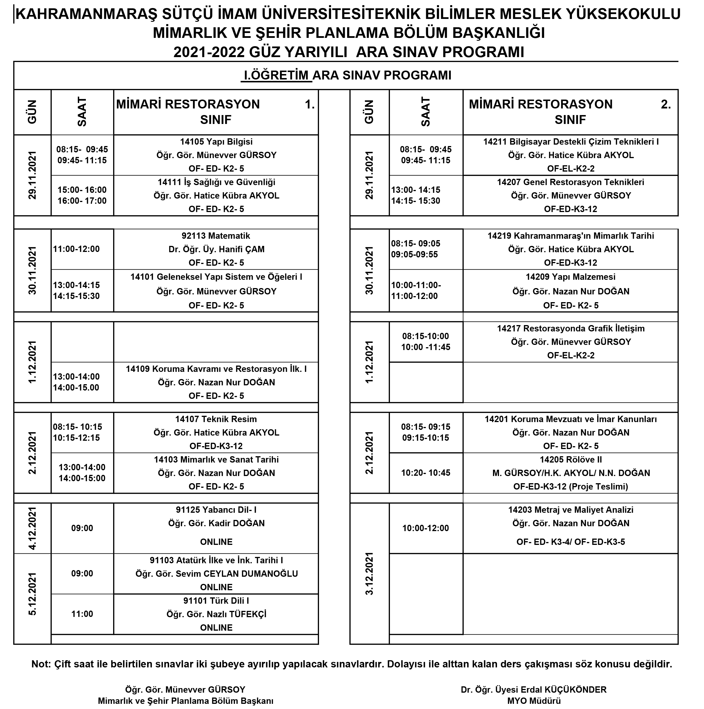 2021-2022 GÜZ YY ARA SINAV TAKVİMİ