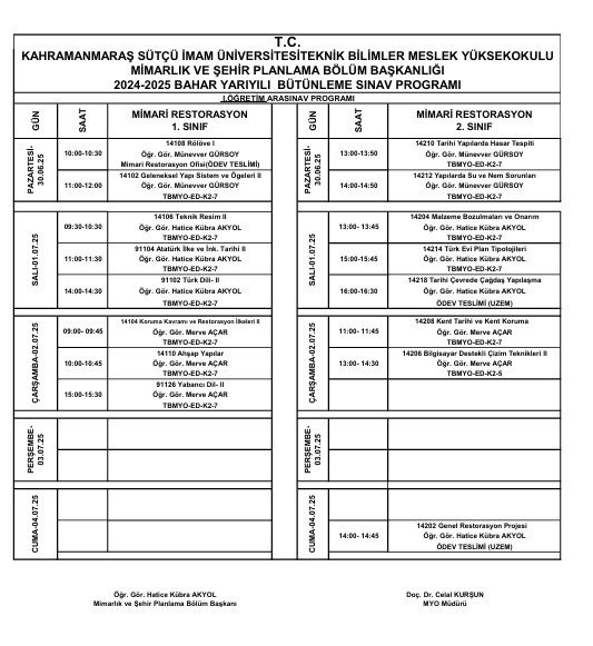2024-2025 Bahar Yarıyılı Bütünleme Sınav Takvimi